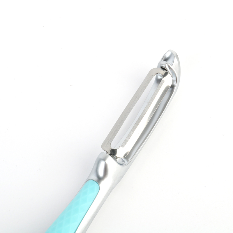 يبلغ طول مقشرة الخضروات الصغيرة المصنوعة من سبائك الزنك باللون الأزرق الفاتح 17 سم وتزن 82 جرامًا، مما يجعلها أداة مطبخ فعالة من حيث التكلفة وآمنة وموثوقة. تصميمها الفريد والأنيق يميزها كأداة مطبخ منزلية عالية الجودة.
