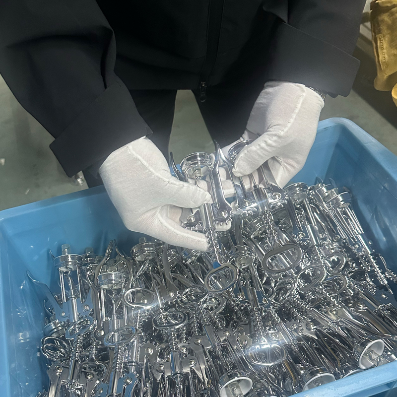 بعد إزالة النتوءات وزوايا الحواف من فراغات مفتاح النبيذ، تنتقل عملية الإنتاج إلى عمليات التلميع والتنظيف. تمتلك شركتنا أكثر من عشر آلات تنظيف ومعدات تشطيب السطح، مما يمكننا من الحفاظ على التوحيد والاتساق في تشطيب سطح المنتج. أكبر ميزة لهذه العملية هي أن جميع المنتجات النهائية سيكون لها تشطيبات سطحية موحدة.