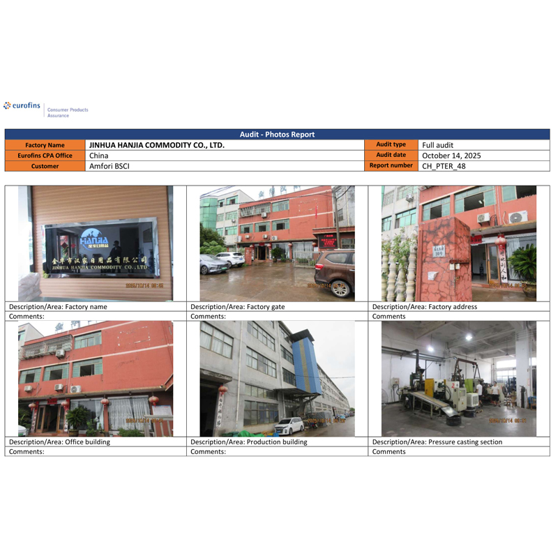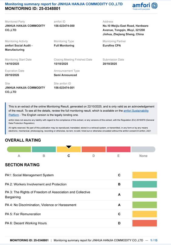 أصدرت شركة Jinhua Hanjia للسلع المحدودة نتائج تدقيق BSCI الخاص بها. في 14 أكتوبر، نجحت الشركة في اجتياز التقييم المهني وحصلت على شهادة الفئة C، التي تلبي الحد الأدنى من المتطلبات المحددة من قبل العميل. فترة صلاحية هذه الشهادة هي سنة واحدة. تم إجراء تدقيق BSCI من قبل وكالة EUROFINS التي اختارها العميل. كان هذا العميل يشتري فتاحات النبيذ وإكسسوارات النبيذ ومنتجات الفولاذ المقاوم للصدأ مثل شاكر الكوكتيل من شركتنا لفترة طويلة. بلد العميل يتطلب من الموردين امتلاك هذه الشهادة.