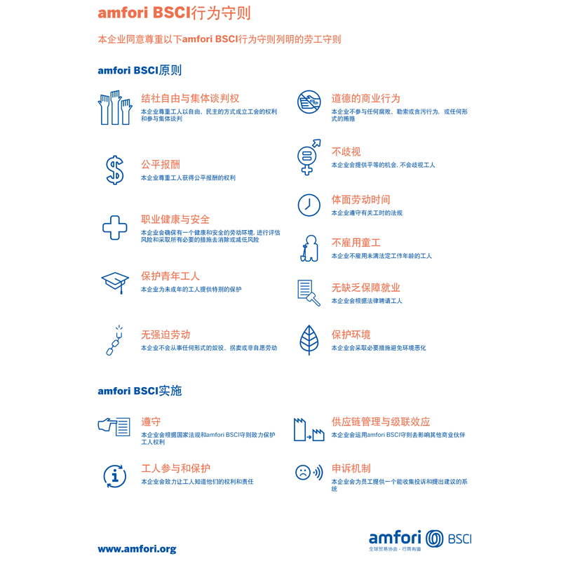 وفقًا لمتطلبات لوائح BSCI، ستلتزم شركتنا بشكل صارم بإرشادات العمل الموضحة في مدونة قواعد سلوك Amfori BSCI لضمان التنفيذ الفعال لمبادئ BSCI. أثناء عملية الإنتاج، نحترم حقوق العمال في إنشاء نقابات بطريقة حرة وديمقراطية والمشاركة في المفاوضة الجماعية. كما نلتزم بعدم التمييز، وتجنب توظيف عمالة الأطفال، ونضمن حصول العمال على ممارسات عمل عادلة وتعويضات. بالإضافة إلى ذلك، نحن نضمن حصول العمال على ساعات عمل لائقة وحقوق أساسية أخرى.
